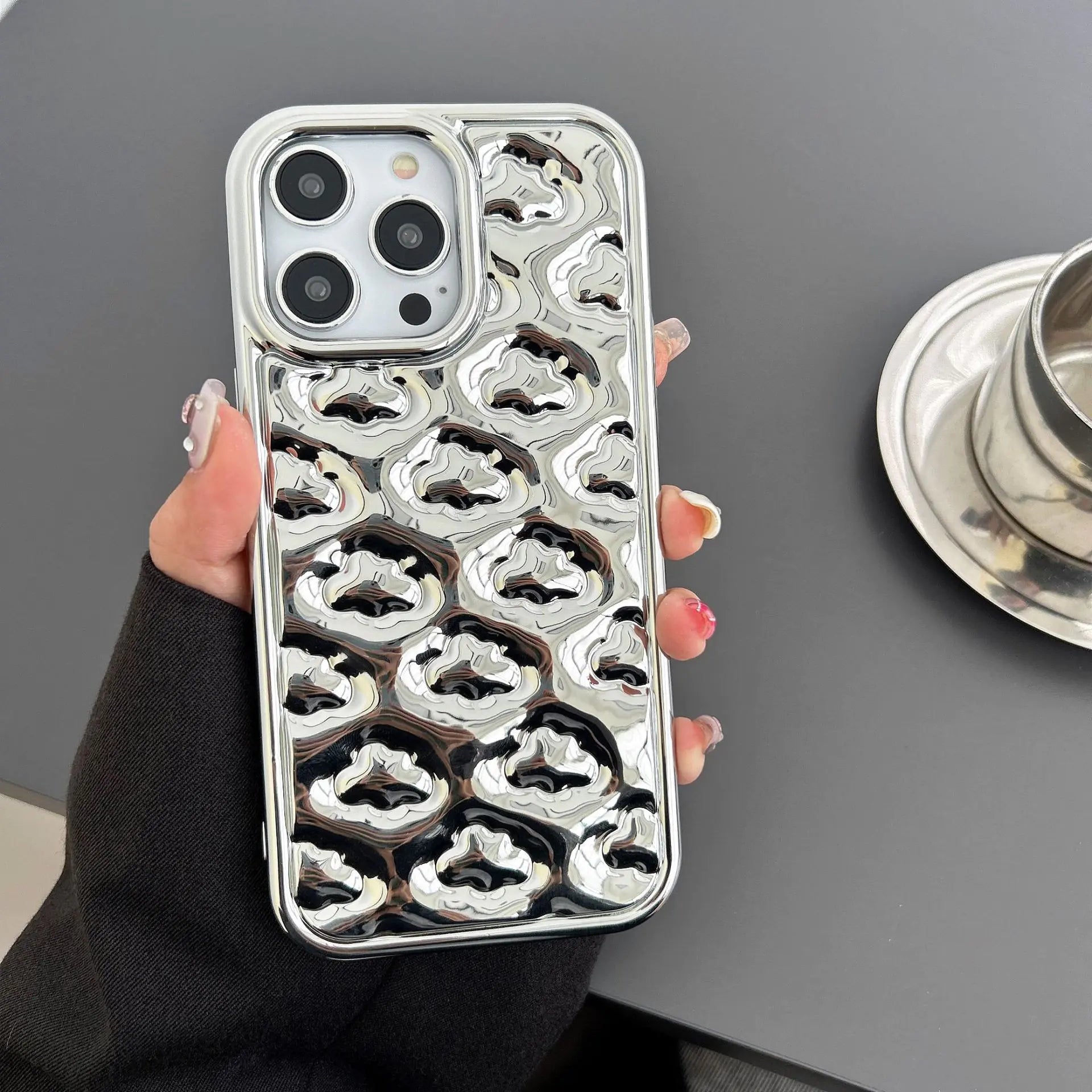 Check out these eye-catching images that showcase the sleek design and finish of our Wave Curved Mirror Phone Case: